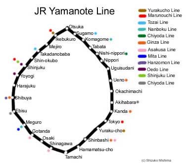 En la foto de arriba se ven, además de las estaciones de la línea Yamanote, las líneas del metro de Tokyo que también pasan por algunas de ellas.